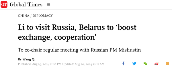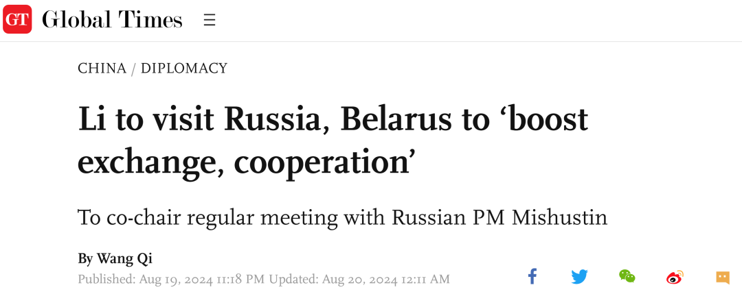 应俄罗斯总理米哈伊尔·米舒斯京和白俄罗斯总理罗曼·戈洛夫琴科的邀请,8月20日至23日,中国国务院总理李强将赴俄罗斯主持中俄政府首脑第29次定期会晤,并访问俄罗斯和白俄罗斯。