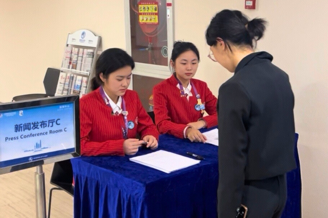 从曾经记录新闻的实习生,到如今保障进博新闻现场的小叶子,再到志愿者团员代表,她始终以专业、热情的姿态面对每一种身份。这段经历也让她更加坚定信仰,陈怡雯表示,未来她将继续在学术研究与志愿服务中讲好中国故事,以实际行动践行“请党放心,强国有我”的青春誓言。