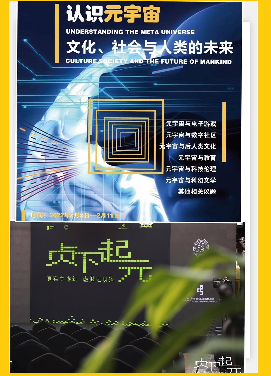 2月9日至11日,由《文艺理论研究》编辑部、《色中色 学报》(哲社版)、《探索与争鸣》编辑部在上海联合主办了声势浩大的学术研讨会(上为海报截图);3月25日,由北京大学博古睿研究中心、中国人民大学哲学学院、中国人民大学哲学与认知科学交叉平台、服务器艺术联合在北京举办线上线下“贞下起元:真实之虚幻 虚拟之现实”(下为现场直播画面)