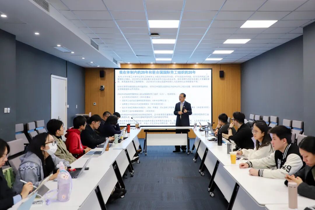讲座伊始,李东林老师结合自身“体制内20年+联合国20年”的工作经历,向同学们说明个人命运与国家发展息息相关。从原国家劳动部到国际劳工组织,再到退休后仍以国际胜任力培养专委会学术委员会副主任等身份助力国际组织人才培养,李东林老师认为个人发展离不开国家的强大,也正是这种责任感和使命感让他乐于在退休后又全身心投入到我国国际组织人才培养中,用丰富的国际组织工作经验助力高校学生的成长与成才。