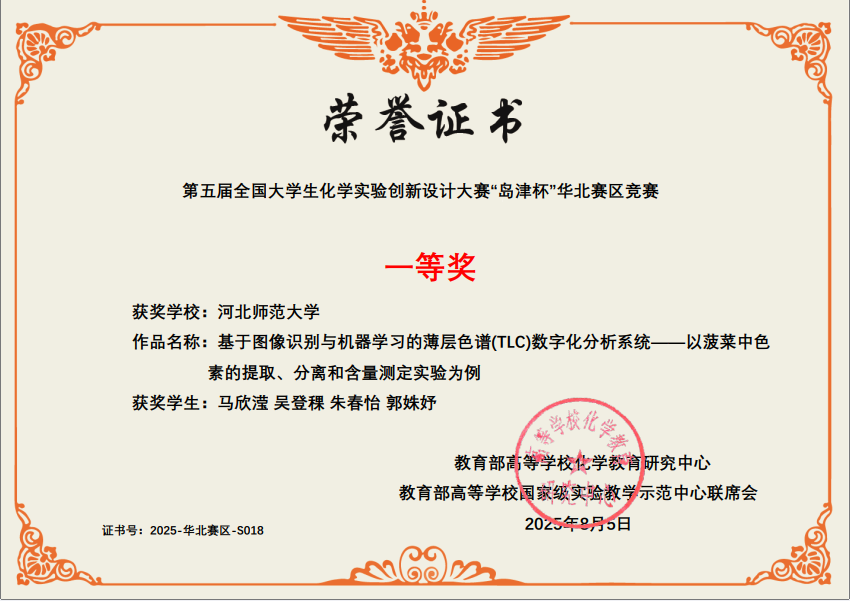 2025年7月12日至14日,第五届全国大学生化学实验创新设计大赛华北赛区竞赛在河北大学举办。沈静伊、张笑和马伊灿学生团队,黎心怡、何文进和张诗琪学生团队,马欣滢、吴登稞、朱春怡和郭姝妤学生团队荣获大赛一等奖,张天诚、张雅琪和蒋斯赢学生团队荣获大赛二等奖。