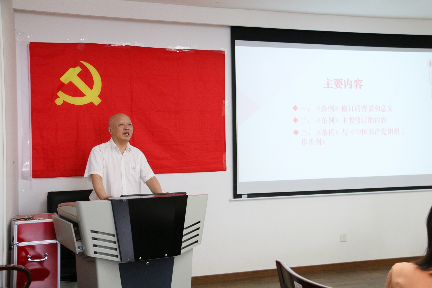 赵正桥强调,全体党员同志要继续立足岗位创先进、履职尽责争优秀,在全系形成崇尚先进、学习先进、争当先进、永葆先进的良好风尚。同时,作为政治学系党史学习教育安排之一,他为全体师生党员解读了《中国共产党高等学校基层组织工作条例》,从《条例》修订的背景和意义、《条例》主要修订的内容等方面进行了细致讲解,使全体师生党员受益匪浅。