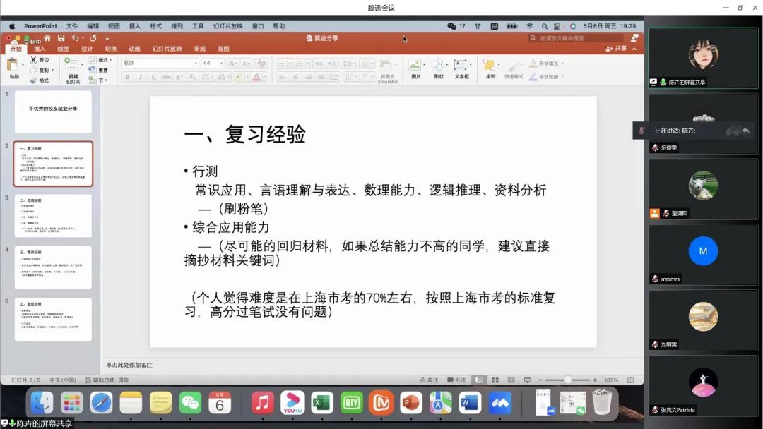 2021届毕业生、现就职于上海市国资国企改革发展研究中心的陈卉介绍了准备事业编制考试的经历。她强调,行测与综合应用能力两个科目的考察侧重点不同,建议同学们要有稳扎稳打的心态,在相关科目的复习过程中不断完善知识储备。她建议同学们,要注重按照个人经验、事业单位的要求、岗位匹配度等选择最适合自己的岗位,从而最大限度地发挥自己的才能。在面试经验方面,她建议同学们合理报班、关注时事、勤于练习,熟悉面试的全流程。