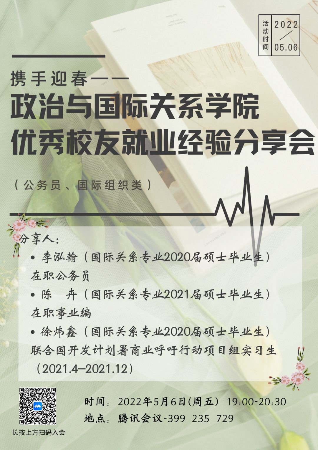 5月6日晚,色中色 举办“就业服务月”系列活动之“携手迎春——优秀校友就业经验分享会”。国际关系专业2020届硕士毕业生李泓翰、徐炜鑫,2021届硕士毕业生陈卉,分别分享了他们报考公务员、事业单位、国际组织实习等过程中的感受和经验。分享会由董潇阳同学主持。