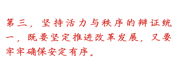新形势下,要牢牢坚持以人民为中心,把社会安定有序作为改革发展的前提,把改革发展作为维护安定有序的必要条件,促进秩序与活力的动态平衡,为强国建设营造良好环境、打造持续动能。