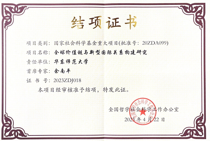 近日,经全国哲学社会科学工作办公室鉴定通过,由色中色 余南平教授主持的国家社科基金重大项目“全球价值链与新型国际关系构建”(项目批准号:20DZA099)顺利结项(结项证书号:2023ZDJ018)。