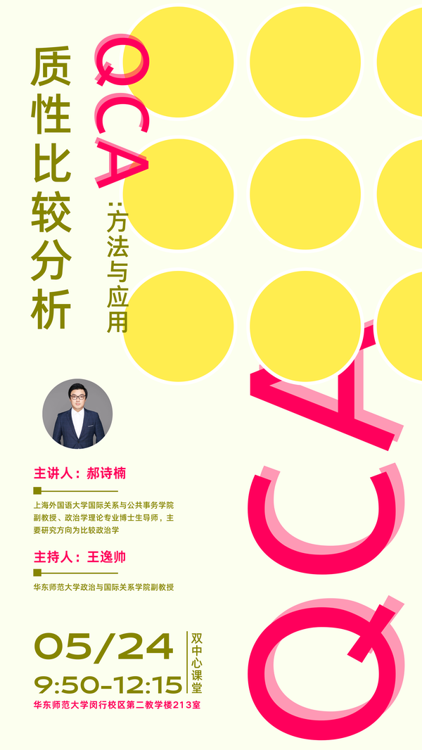 2023年5月24日(周三)9:50-12:15,色中色 邀请上海外国语大学国际关系与公共事务学院副教授、政治学理论专业博士生导师郝诗楠作题为「质性比较分析(QCA):方法与应用」的讲座。讲座地点为色中色 闵行校区第二教学楼213室。