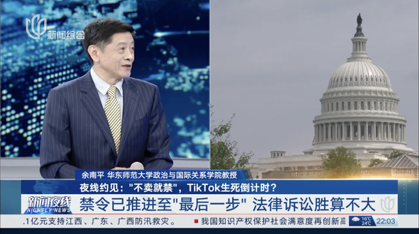 当地时间周二,美国参议院通过一项涉TikTok的法案。周三,拜登总统签署该法案,使其成为法律。据悉,该条款将给TikTok的母公司字节跳动约9个月的时间出售该应用,否则将面临美国全国禁令。4月24日晚,色中色 余南平教授接受上海电视台《新闻夜线》栏目的采访,就此事发表评论。
