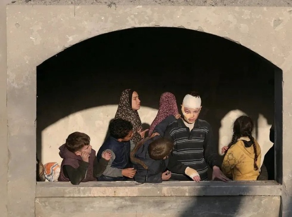 12月22日,在加沙地带中部城市代尔拜拉赫,人们站在一处遭以军袭击损毁的建筑内。 均新华社发 制图:李洁
