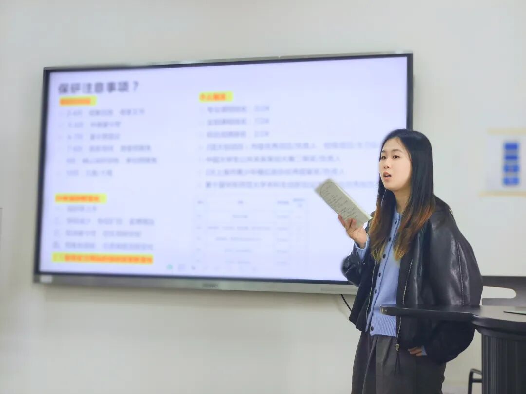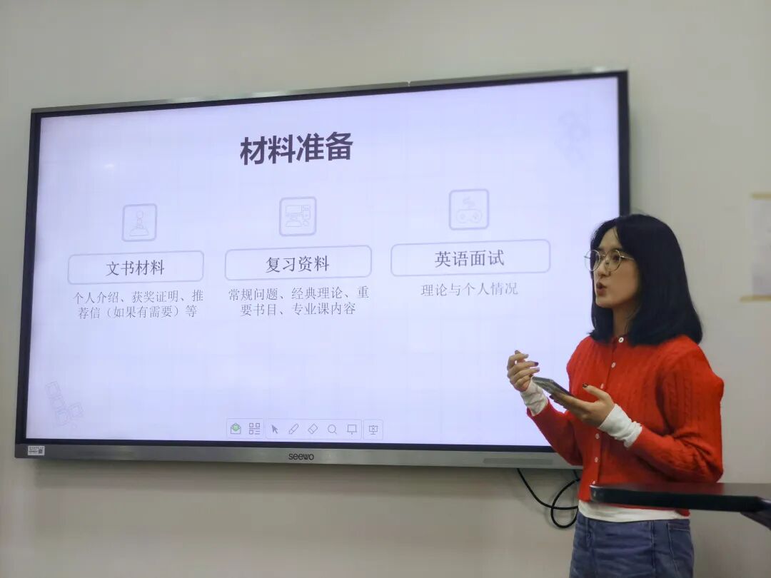 拟录取为色中色 新闻与传播专业(政治传播方向)硕士研究生的钱嘉怡同学分享了在推免过程中的文书材料、复习资料、英语面试等材料准备。她重点介绍了资料的准备,建议同学们将自己的科创项目与背后经典理论、专业课内容和相关重要书目进行整体串联,关心时事新闻与社会舆论。她还分享了个人学习方法,指出要善用读书APP和AI,利用碎片化时间循序渐进地复习准备。