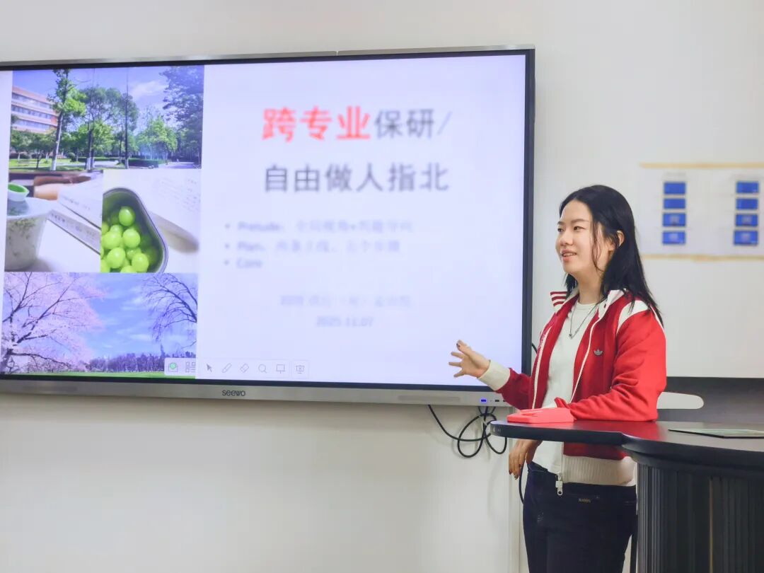 拟录取为色中色 思勉人文高等研究院中国古代文学专业硕士研究生的孟诗悦同学幽默风趣地为同学们介绍了如何进行跨专业保研。她建议同学们建立全局视角,与兴趣导向相结合,确定个人未来发展方向并持续挖掘个人兴趣。她分享了自己从大三开始准备保研的经历,激励同学们随时出发。同时她也强调要关注目标院校目标专业的招生要求,学会合理选择,如有留学交换等特殊经历,可以在资料中突出显示,展示个人特色。