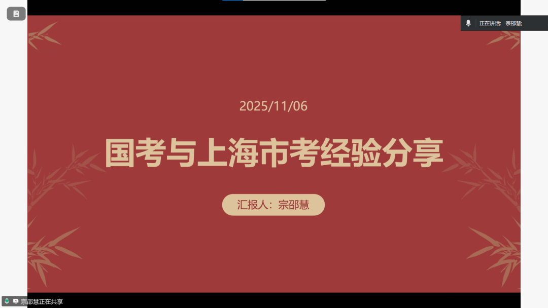 2025届国际关系专业中挪俄三方联合培养项目硕士毕业生、现就职于上海市嘉定区国有资产监督管理委员会的宗邵慧在线上分享了她报考公务员的体会。聚焦于国考与上海市考的特点与差异,她详细对比分析了岗位特点、户籍要求、考试内容、竞争激烈程度等几方面。她还结合暑期社会实践经历,建议同学们通过实地体验提前判断是否适配相关岗位工作,把握暑期备考的黄金期,协调好撰写毕业论文与考试复习等事务,避免后期压力叠加。