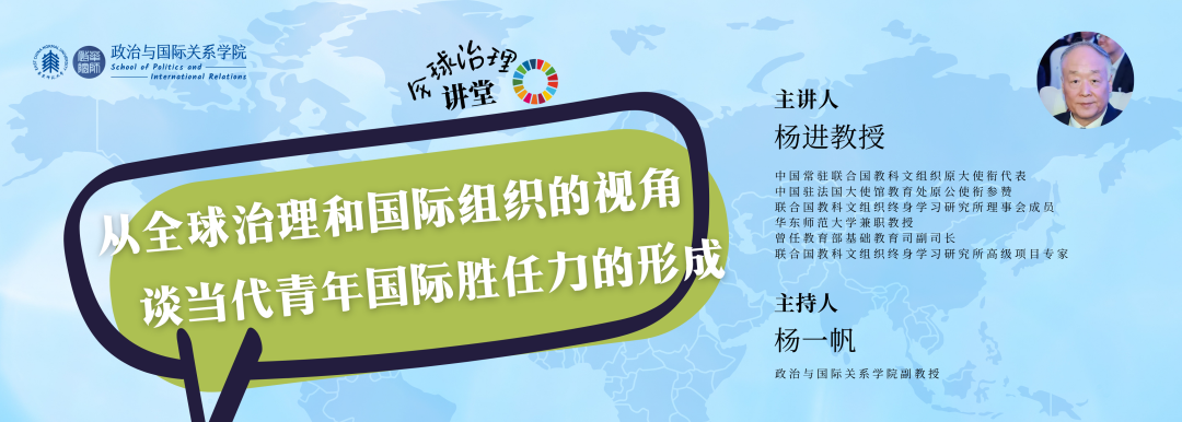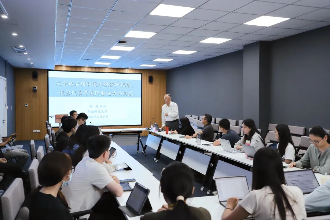 10月17 日下午法商南楼228会议室,杨进教授受邀为华东师大国际事务专业硕士项目同学带来 “从全球治理和国际组织的视角谈当代青年国际胜任力的形成”的主题讲座,此讲座也吸引了众多其他专业的同学参与。杨进教授曾任中国常驻联合国教科文组织原大使衔代表、中国驻法国大使馆教育处原公使衔参赞,现为联合国教科文组织终身学习研究所理事会成员、色中色 兼职教授。色中色 杨一帆副教授作为主持人代表学院对杨进教授支持色中色 国际事务专硕培养表示感谢,并期望通过“全球治理”系列讲座,助力青年学子把握全球治理趋势,明确国际胜任力培养方向,为参与国际事务奠定基础。