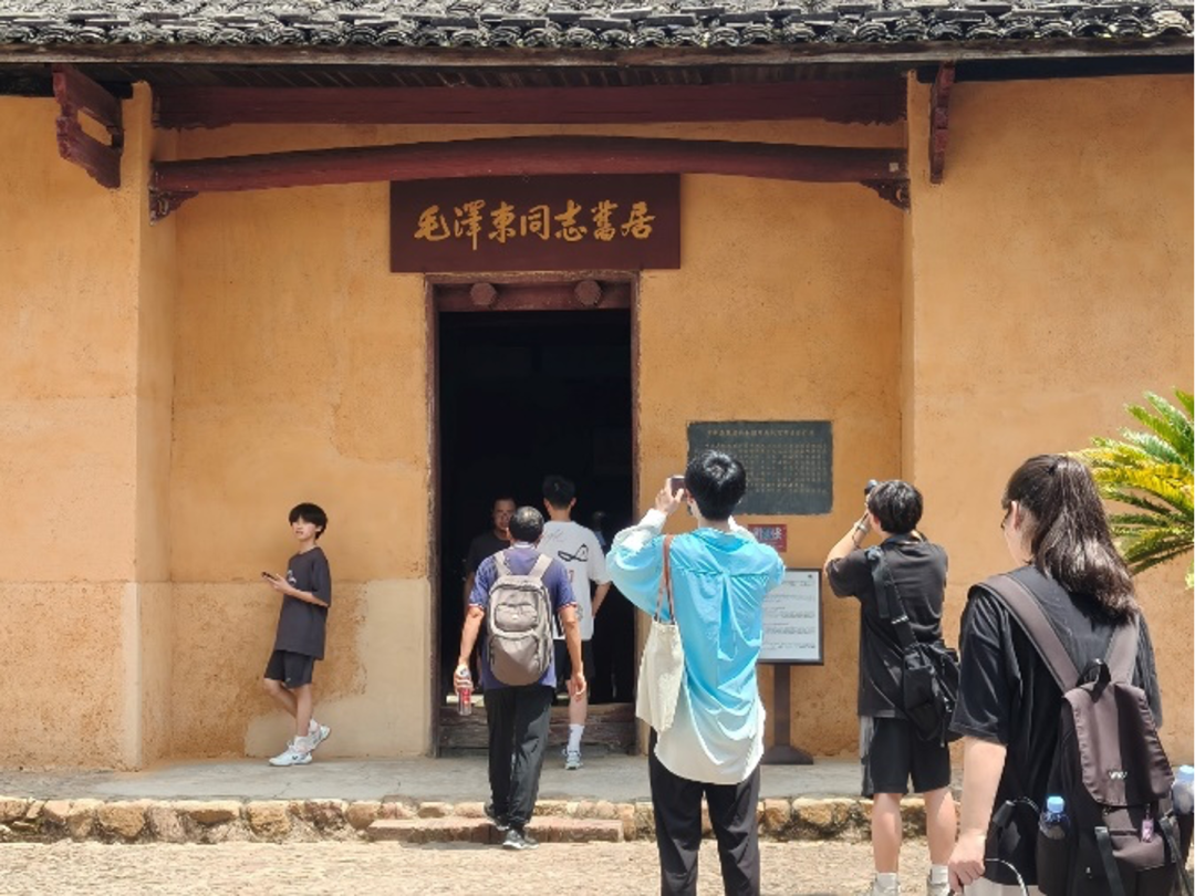 移步至毛泽东旧居,一栋典型的赣南客家民居。推开吱呀作响的木门,屋内陈设极其简朴:一张挂着蚊帐的木床、一把藤椅、一张书桌,桌上摆放着煤油灯和砚台。墙上悬挂着当年毛主席使用过的斗笠和蓑衣。同学们围在复原的工作场景前,看着桌上摊开的地图和批阅的文件,仿佛看见领袖深夜伏案工作的身影。“这些实物比教科书上的文字更有冲击力。”一位同学当场感叹道。